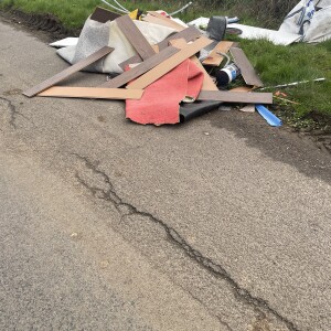 Public bridleway blocked by pile of rubbish dumped in the path. Bed, mattress and sofa also left in the hedgerow.