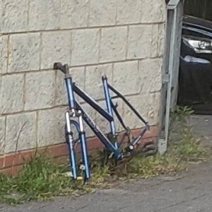 Dumped push chair on path Birchway near nursery school entrance.