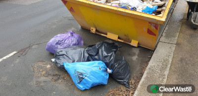Rubbish bags dumped either side of registered skip to 114 Elphinstone Road. The rubbish looks like it might be commercial as it contains lots of empty alcohol bottles. The bags are very taped up. More bags seem to be added every day.