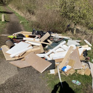 A grey sofa base on the footpath next to the cemetery wall near the corner of View Lane and Cemetery Road, Stanley
