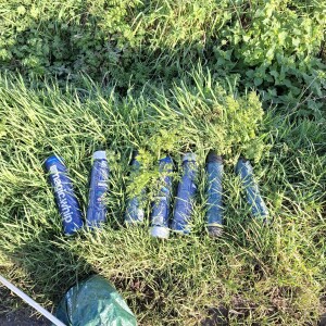About 4 plastic large bottles with liquid in some of them and a blue plastic bag. On the right hand side just before the new estate.