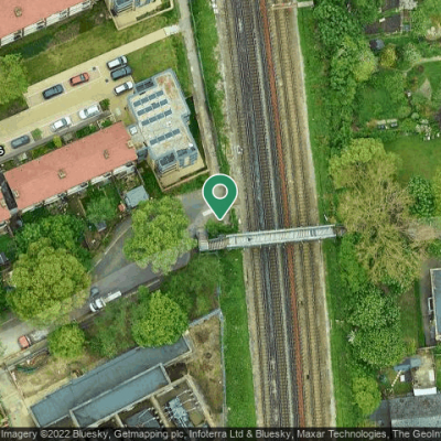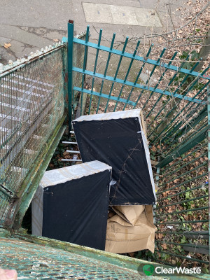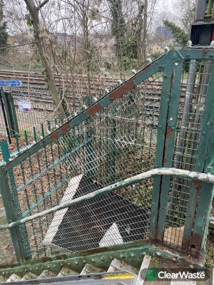 Divan bed base and misc rubbish thrown over fence at base of public footbridge