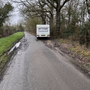 Abandoned caravan was previously dumped in middle of road and has now been moved to site of carriageway on bend by junction with forge lane