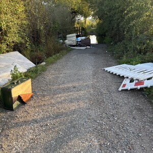 Fly tipped pile in grass area just off road along water lane approaching roundabout at Tylers Cross. Can't stop to photograph this..