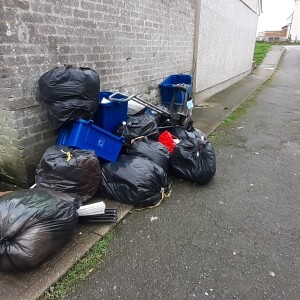 Caravan left in lay-by for at least three weeks. Filled with rubbish and now being vandalised. Has been turn around around and hitch is now causing a potential accident in close proximity to oncoming traffic on carriageway. No obvious registration