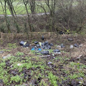 2 bags of chicken feathers/parts that are on the pavement and in the road way, there are also a few boxes in the tree line