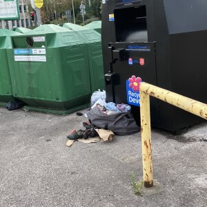 Large amount rubbish dumped on roadside, some fallen into the road, plus a mattress in the hedge