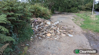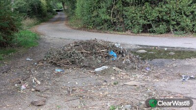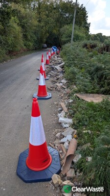 There are three separate piles of waste. Two piles are primarily composed of hardcore, and one is made up of green waste. One pile appears to have been dumped in the road which has been pushed to one side and coned off.