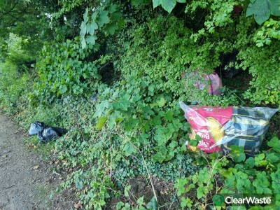 6 bags of mixed house hold waste dumped next in the tree line next to road.