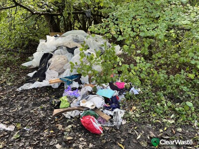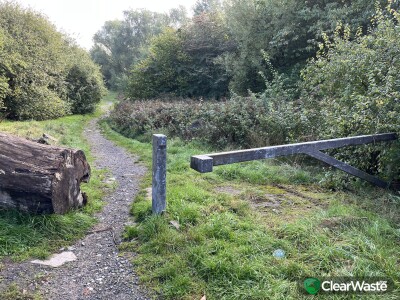 Further fly tipping near burnt debri on playing field off Alan ramsbottom way further down path hidden in wooded area large lorry load of general waste on the public footpath itself .