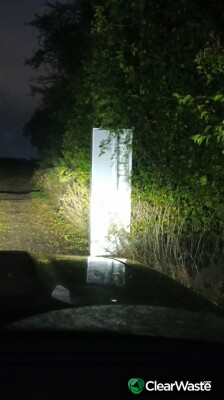 Tall fridge/freezer, dumped on public byway. Access for transit van to collect is good, surface solid.