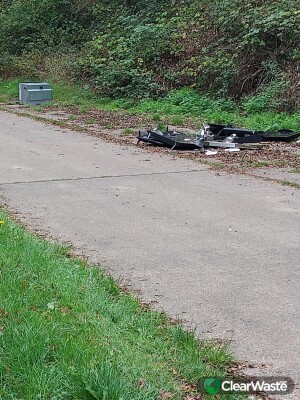 Waste is dumped in a car parking area by side of what is now a quiet lane and access to farm. It looks like big pieces of moulded plastic, possibly car body panels and close by is what looks like an old built in oven housing.