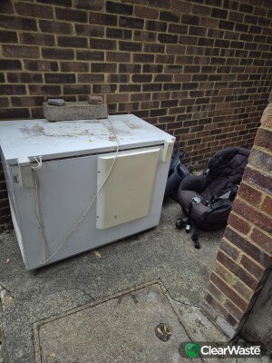it's an empty white chest type freezer which has been left on the street by the bins on entrance to Windfield close (off of Queensthorpe Road) SE26 4PQ