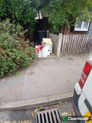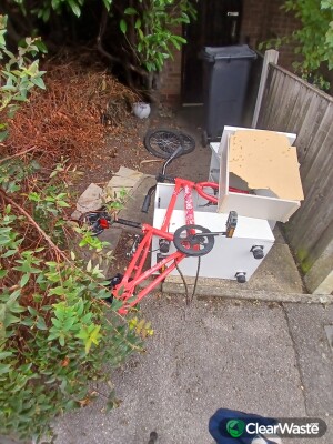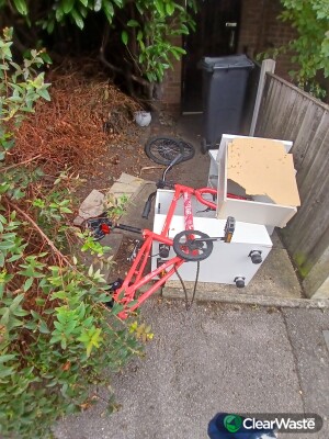 So far a broken pedal bike.several wheels .two double draw cupboards,other bits of rubbish .found to the left of 11 Laing close ilford near the bushes,