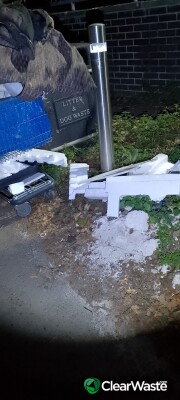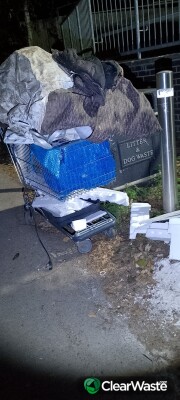 Shopping trolley full of rubbish, electrical items and polystyrene dumped by the litter bin in Lane End. Seems as fast as it's cleared some scumbag dumps more.