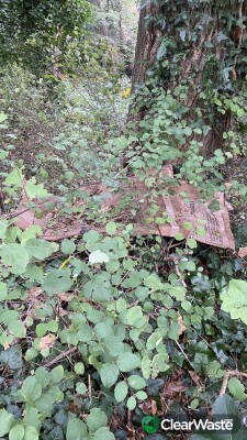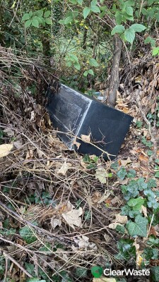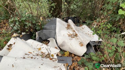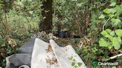 All thrown over fence into a wooded area. Flooring, building waste, black bin bags and what looks like a cupboard