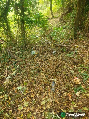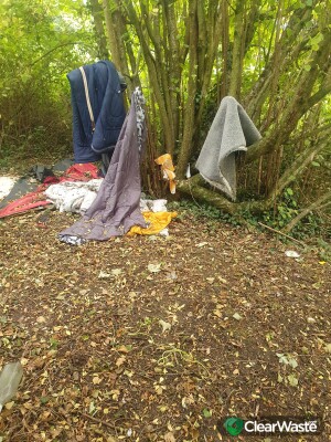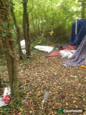 Looks like an abandoned rough sleeping area. In the trees at the junction of two byways leading up from Coate Rd. Discarded sleeping bags and mattress. Whole area strewn with bottles, cans , plastic bottles and other rubbish. Some human rubbish