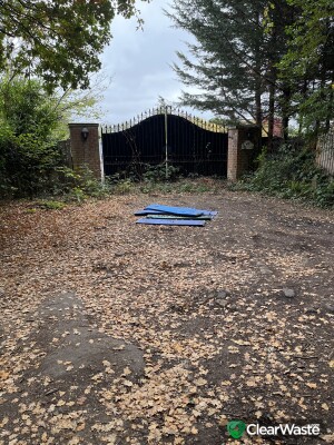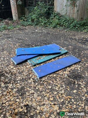Soft fabric covered boards dumped in front of gates at the very end of Hurst Lane