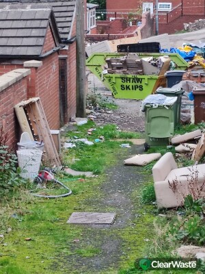Not cleared since July, more rubbish/furniture since dumped, alley now littered top to bottom & extremely bad on both ends.Council was notified in summer of weeds growing out of control and if left would attract fly-tipping, request to clear ignored.