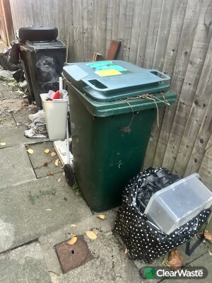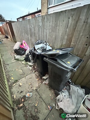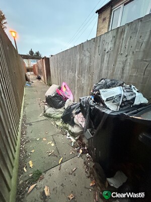 Alley between Guildford and Burnham Road. Bins full of waste and garden, bin bags and dismantled fire surround. More being added to daily