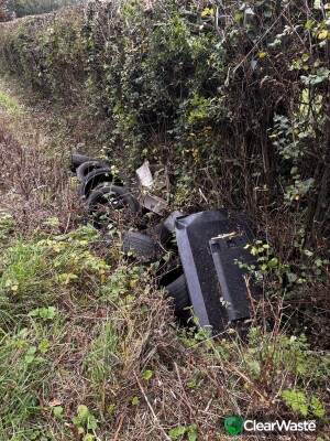 Tyres, car parts; in the drainage ditch to the side of the road in the location pinned.