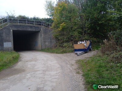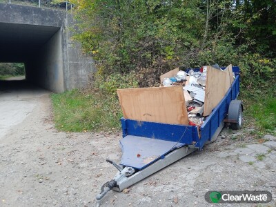 Trailer full of rubbish dumped next to underpass just at side of black lane.