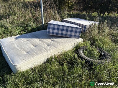 Bed and mattress dumped. Close to an old mattress that was reported several months ago.
