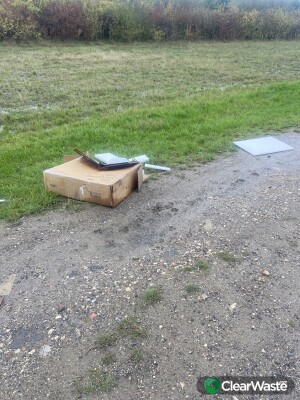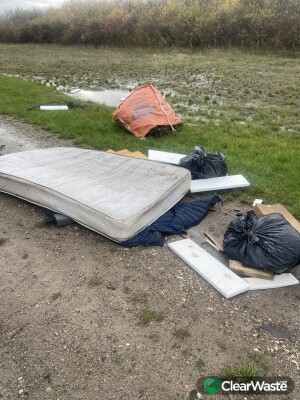 Garden waste, mattress, wood, black bin liners, cardboard box.
