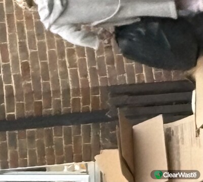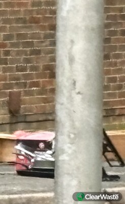 Outside on public footpath under street light, large book case type unit, oil can type thing and various other bits, blacks sacks which have been put out 4pm SUNDAY, heaps of cardboard/boxes also Sunday at 4pm