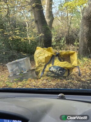 large yellow bag and two plastic boxes. One box may contain paint tins. Its on Pembridge Lane behind the Zoo west of Wood House Lane, close to Zoo overflow car park, east of Elysium House
