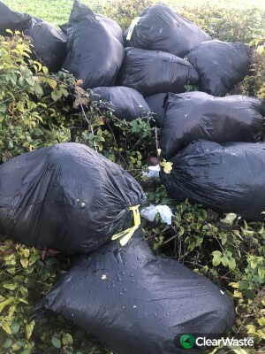 about 30 black bin bags full of loft insulation dumped in lay by on the edge of a very busy road leading to crossroads.
