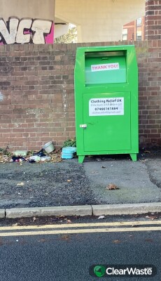 Pressure cooker and various Tupperware containers and general waste dumped next to clothing bank on Grosvenor Road