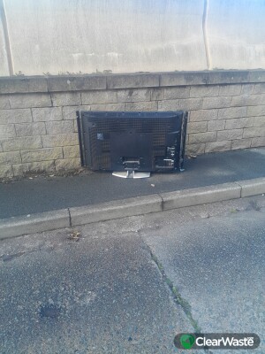 Large tv left against sea wall defences opposite 83 Sandylands Promenade Heysham Morecambe LA3 1DP