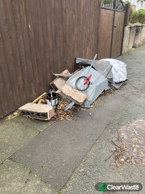 Fly tipping on Blackheath Drive Leasowe close to its junction with Reeds Lane, Leasowe Wirral. General waste and rubble causing an obstruction to Blackheath Drive pavement.