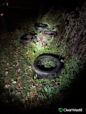 5 used tyres of different sizes. On the grass verge in front of the gates.