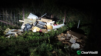 Construction/Household waste dumped on public byway. Access possible for Transit Tipper type vehicle, but come in from Hall Road, and stick to the gravel parts of the byway, don't get too close to the field edge.