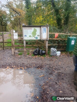 Several bin bags of general rubbish and a discarded campervan porta potties. Retrieved from undergrowth and left under woodland sign in carpark