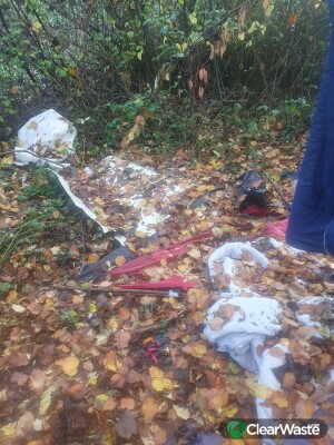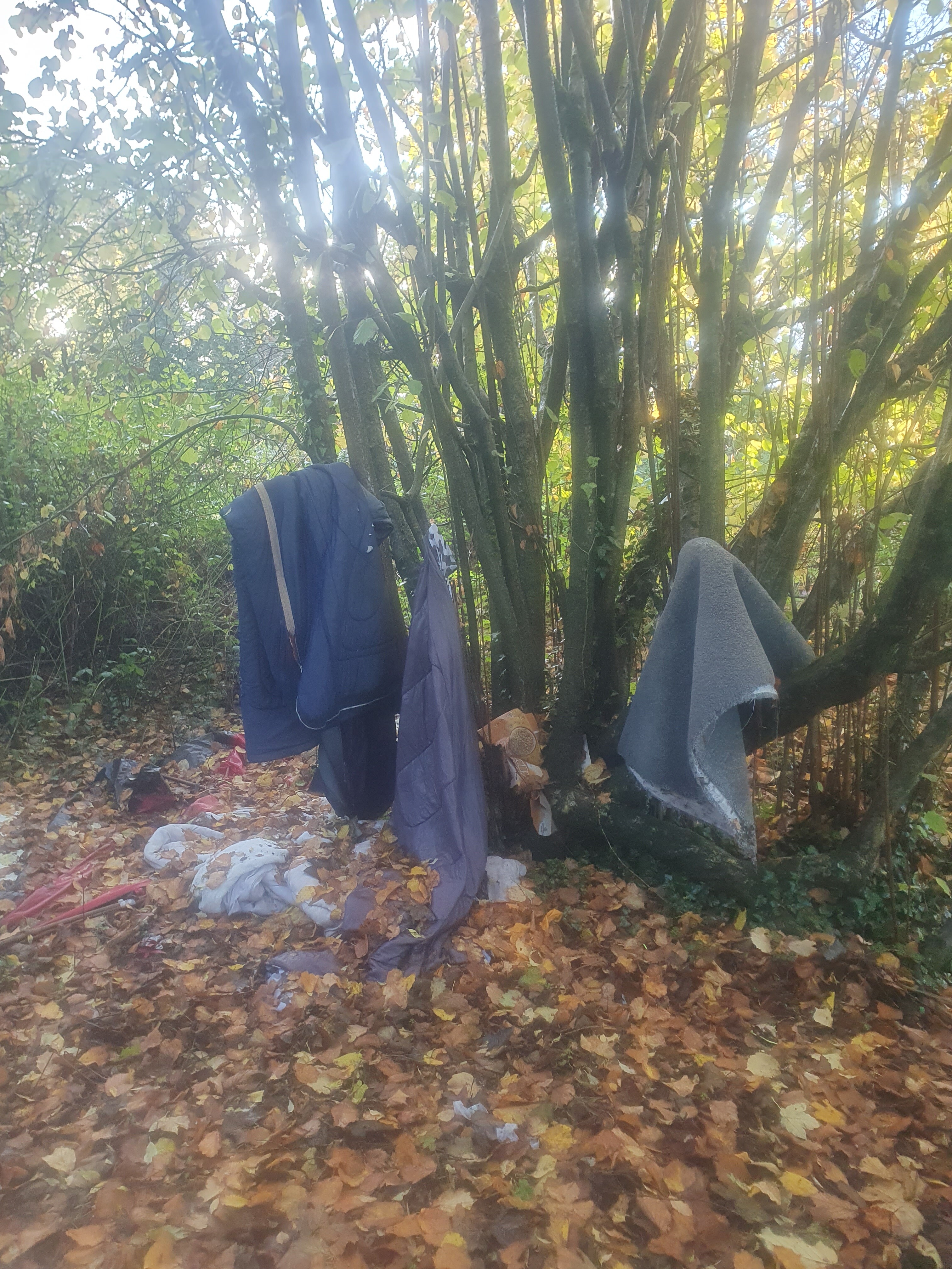 Reported several weeks ago. Deserted rough sleeping area. Hidden behind bushes near junction of the two foot paths. This area needs to be professionally cleared due to type of rubbish. Council seen to be ignoring it.