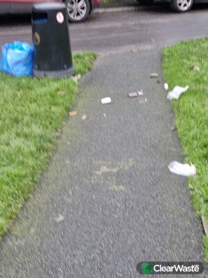 Rubbish strewn on verge and blue bag put out more than a week before bin day