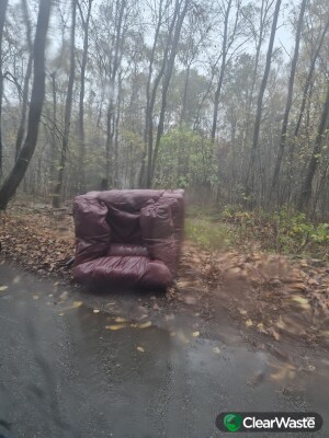 Padded chair dumped on Pembridge Lane between entrance to Broxbourne Woods East Car Park and the track entrance to the east of the Car park. Less than 100 m. North side of the road.