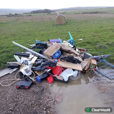 Household clearance - children's toys and furniture. Also, more items along the road. Two main dump sites. V5 document found for a motorbike dumped at one of the two sites (now gone). Two vehicles witnessed - see photo