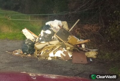 Mixed waste dumped on a public byway. Looks to contain similar materials to the waste dumped further up the same byway. Access is very good for a Transit Tipper type vehicle to collect. Hard gravel, not fair from the main road.
