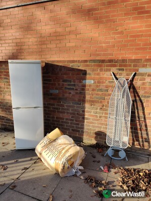 A refrigerator, an ironing board, domestic waste