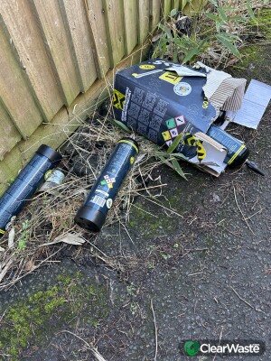 Cylinders & box with what looks like Hazardous signage on. Footpath between Sewell Avenue & London Rd