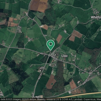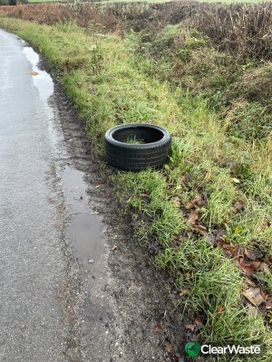Truck tyre. On right when passing turning for whitfordd towards trelogan.