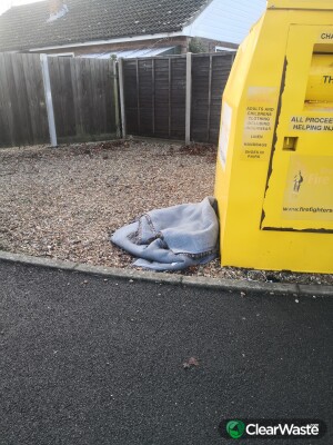 Carpet flytipped next to clothes recycling at fire station