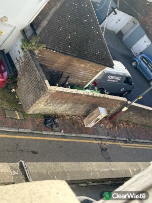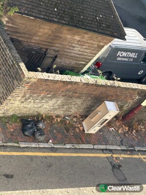 television unit and rubbish bags dumped next to a large waste bin - waste bin has been moved since