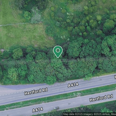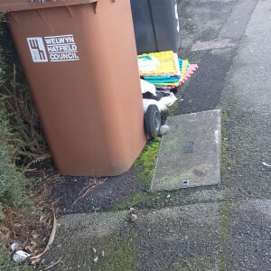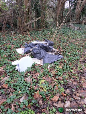 Building waste, old tiles and toilet. Just off cycle footpath next to A414. Always the same area rubbish is dumped.