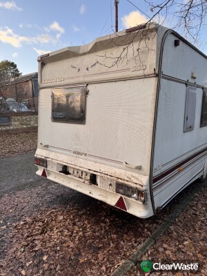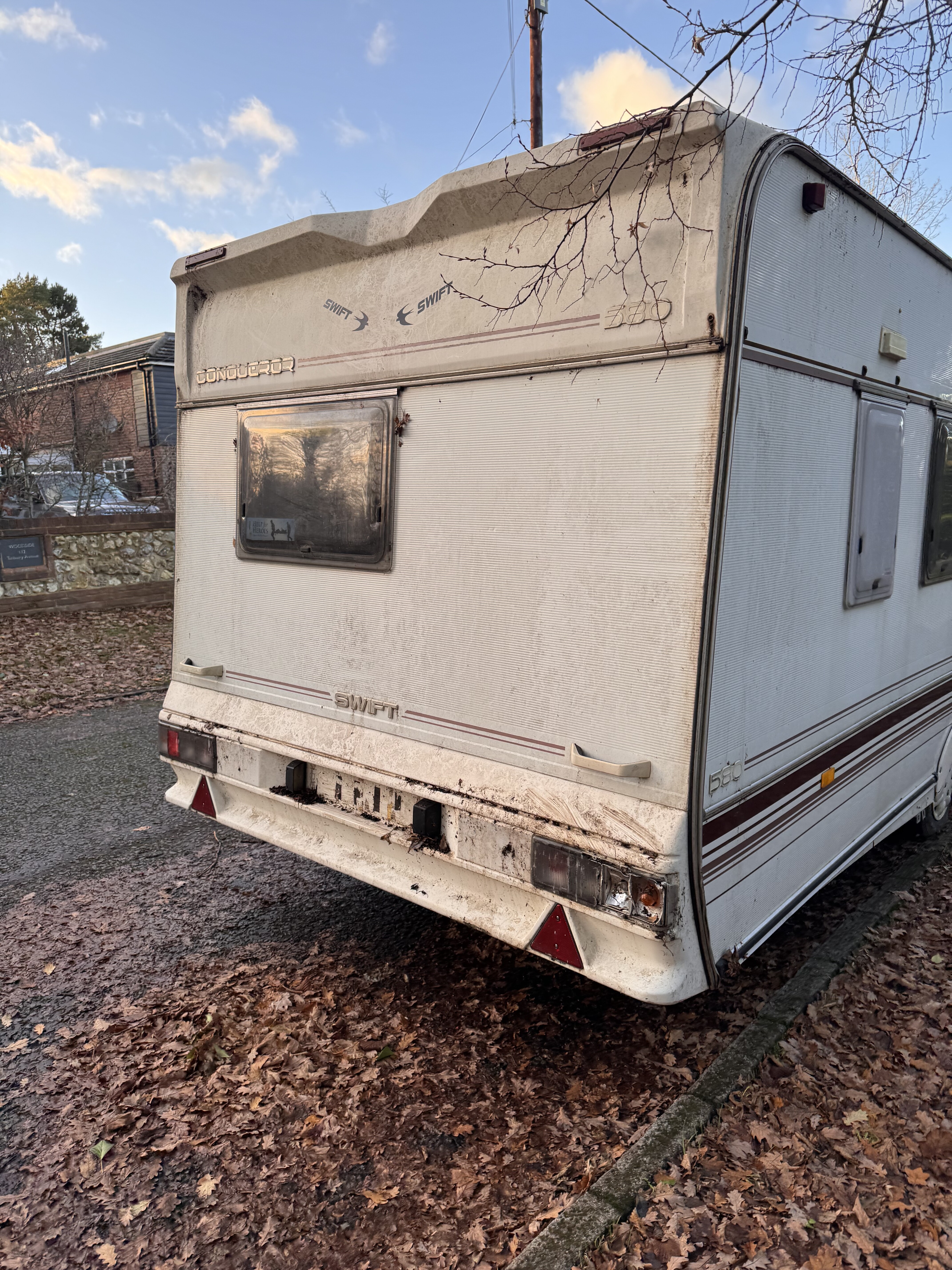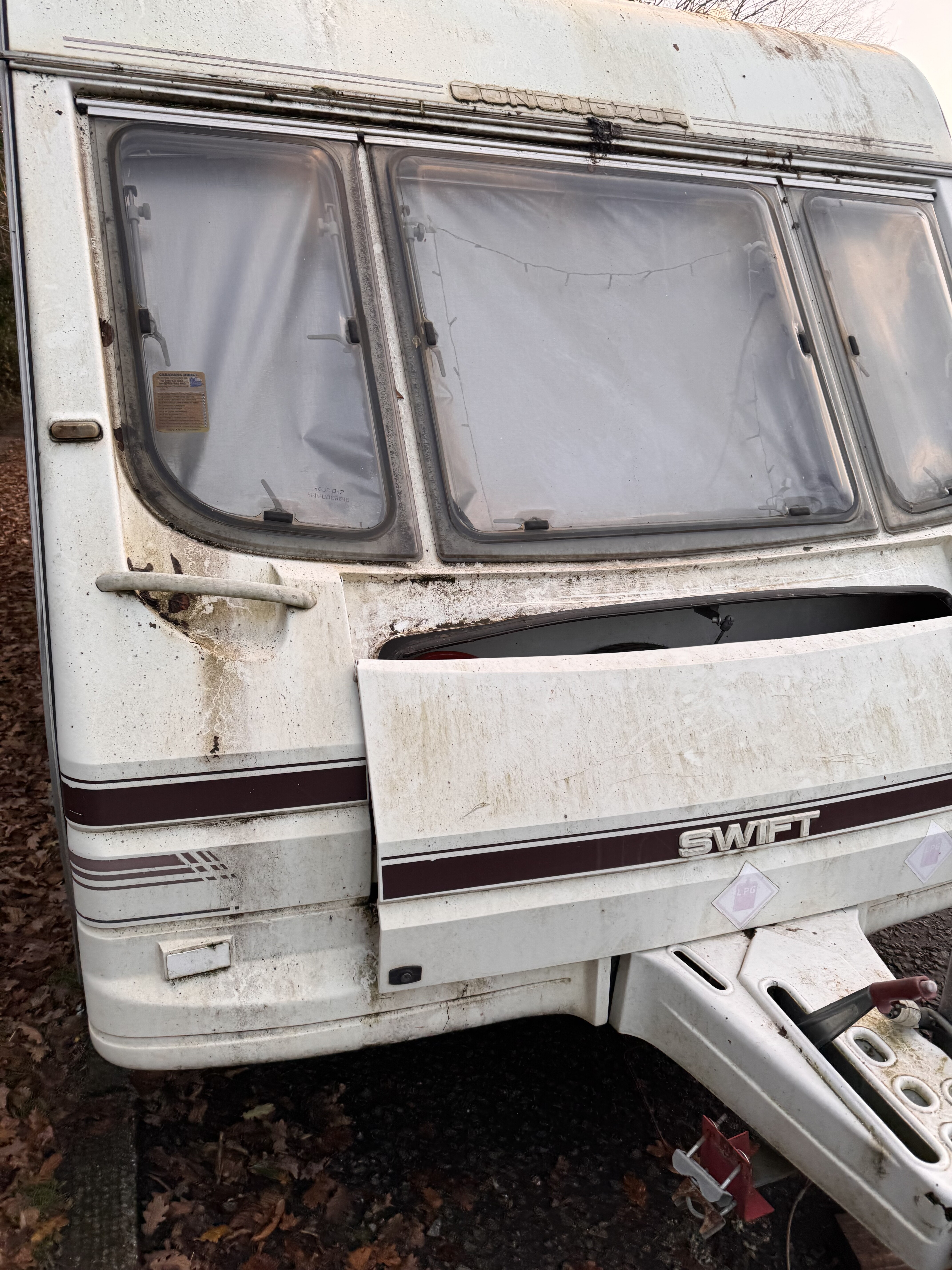 Campervan/Caravan with registration plates removed and dumped. Looks like it been damaged or robbed and is just rotting away.