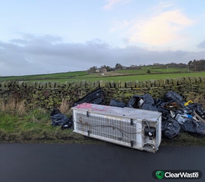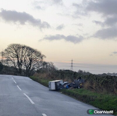 Fridge dumped and other household items. Dangerous as fridge is obstructing the road after a blind bend. Stubbed out fag ends on the fridge could have DNA on them... Nail the scumbags!